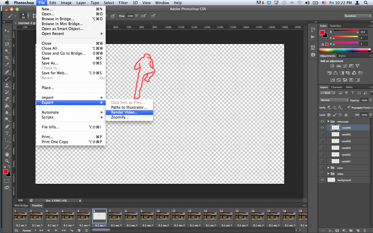 15. Once the drawing and painting is complete and a background is set, hide the video group to export the animation by selecting all frames in the Timeline and then clicking the eye icon or visibility icon of the Video layer in the layers panel. Once the video image is no longer visible go to File > Export > Render Video and choose the preferred settings.
