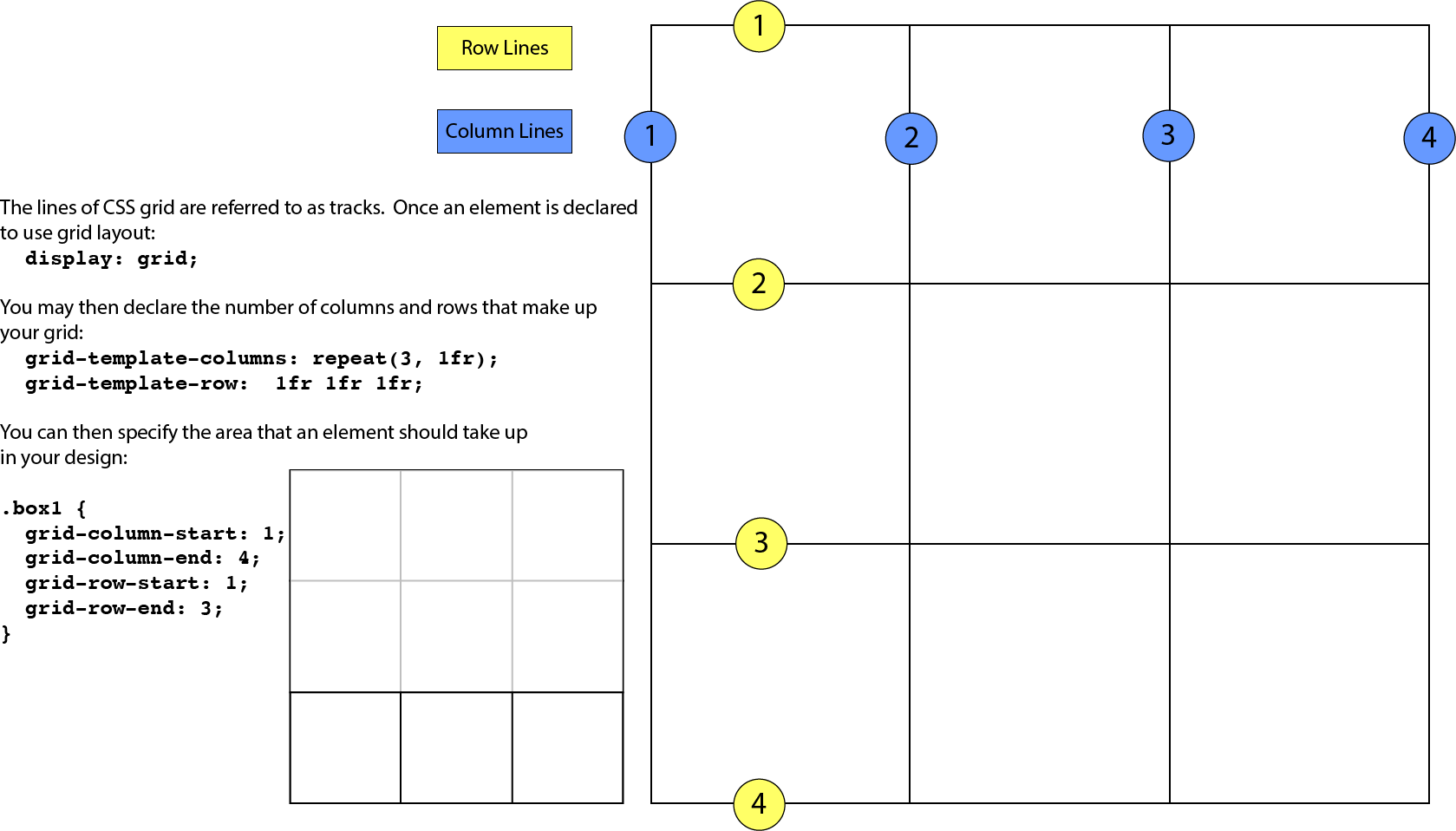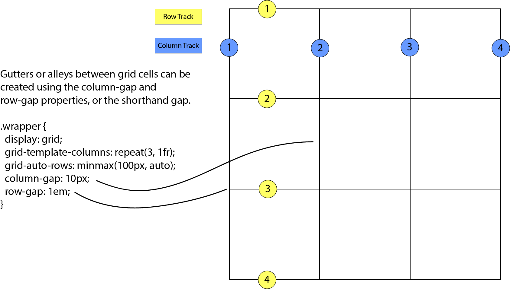 The space between two adjacent grid lines is a grid track, which is a generic name for a grid column or a grid row. Grid columns are said to go along the block axis, which is vertical (as block elements are stacked) for languages written horizontally. Grid rows follow the inline (horizontal) axis.